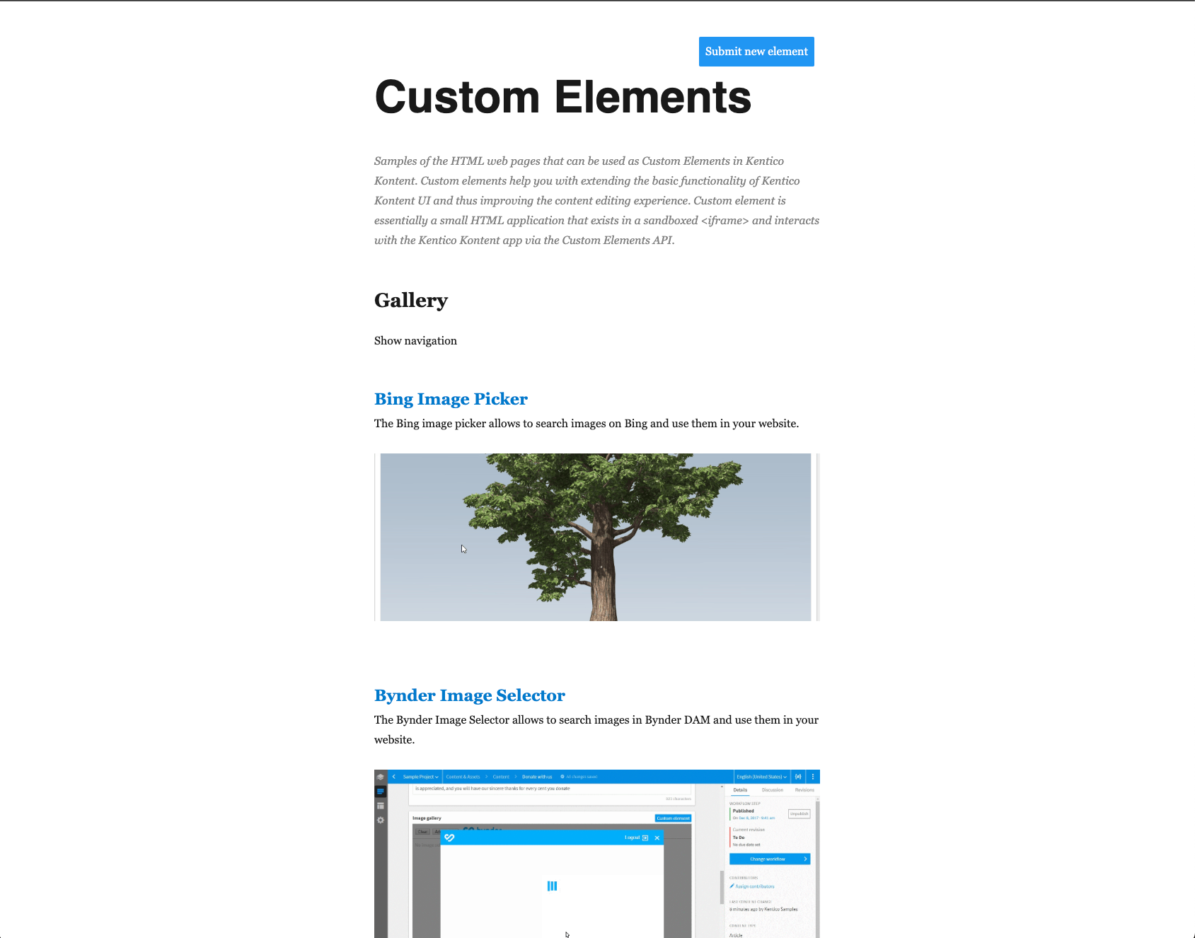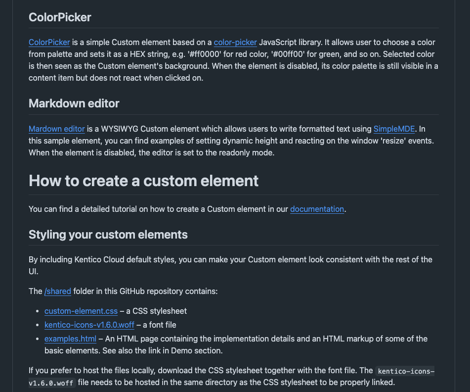 As more developers began building their own custom elements, our project quickly evolved. We transformed our initial repository into a comprehensive catalog using Gatsby.js, inviting community submissions and sharing custom elements that were both innovative and practical. This catalog not only served as a code repository but also functioned as a deployment center (via GitHub Pages) for these elements. The repository became a valuable resource for consulting and professional services, showcasing the creativity and potential of custom elements within the Kontent.ai ecosystem.