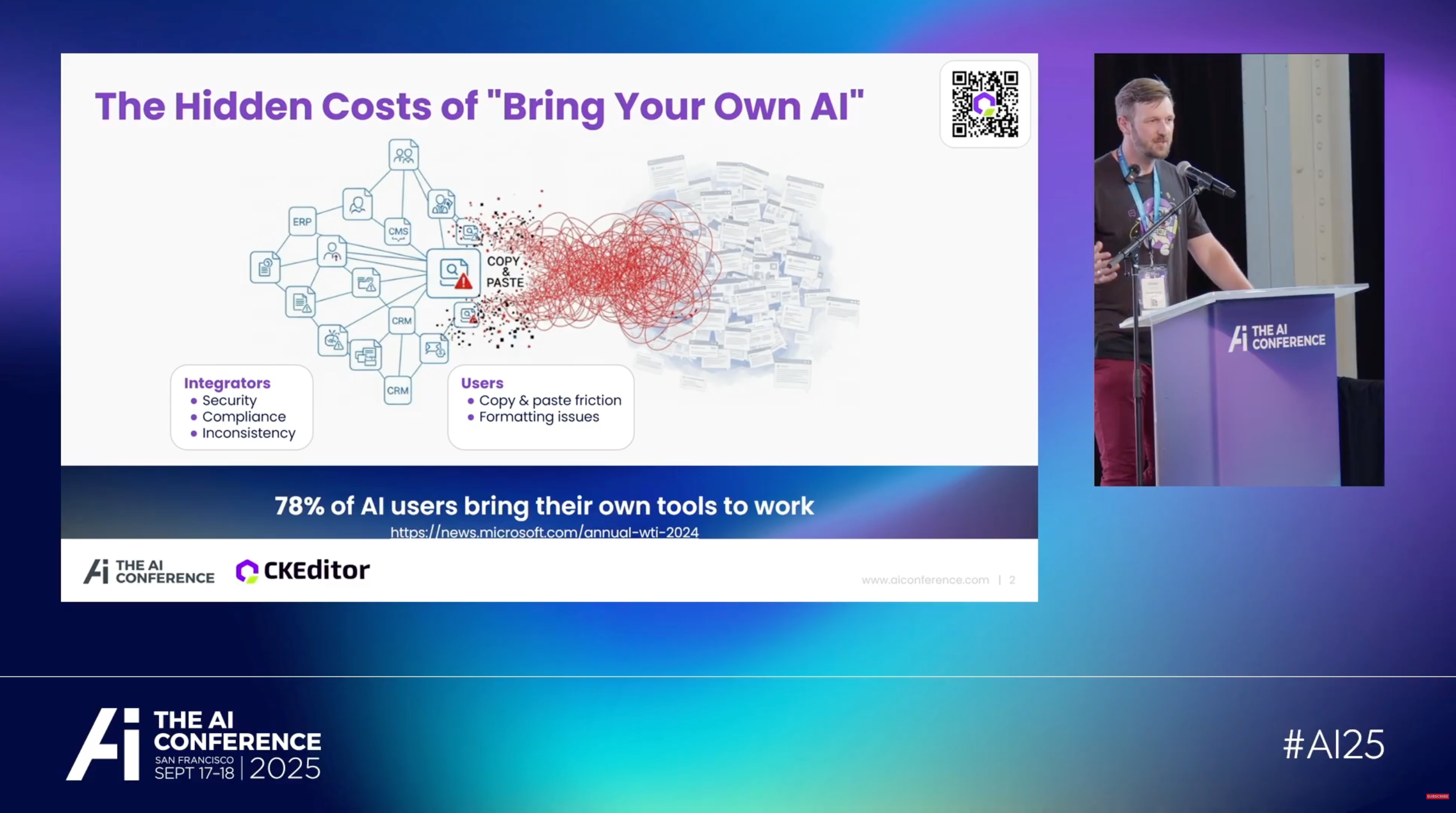 In this lightning talk delivered at The AI Conference 2025, I address the growing friction and security risks caused by the "Bring Your Own AI" (BYOAI) trend, where 78% of workers use external AI tools to generate content. I highlight how copying and pasting from external chatbots breaks formatting (tables, lists) and introduces compliance vulnerabilities for enterprises.